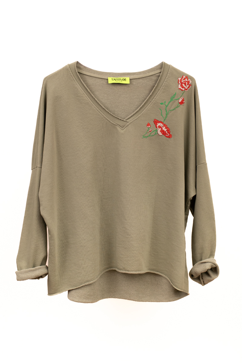 Relaxed sweatshirt crafted from soft 100% cotton with a lightweight feel. Defined by its floral embroidery detail and raw-edge finishing. An effortless piece designed for everyday styling.