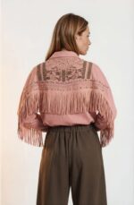 Dusty pink denim jacket featuring floral embroidery, metal studs and bold fringe detailing across the back and sleeves. structured cotton denim with a defined western influence.